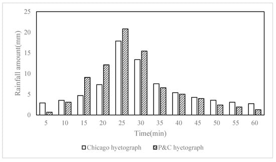 Because the design rainstorm derived by the Chicago rainstorm method (denoted as Chicago hyetograph) can only be a single-peak rainstorm, it is only compared with the single-peak rainstorm hyetograph derived by the P&C method (denoted as P&C hyetograph). The 60-min design hyetographs with 20-year return periods are shown in Figure 7. The total rainfall amount of the Chicago hyetograph (76.46 mm) is smaller than that of the P&C method (82.51 mm), due to the different data used in both methods. The parameter of the intensity rainstorm formula in the standard of rainstorm intensity formula and design rainstorm distribution in Shanghai was estimated using rainfall data from the rain-gauge stations in the range of the whole city of Shanghai, while the P&C hyetograph only used rainfall data of two rain-gauge stations near Yangpu District. The P&C hyetograph is more typical for the study area in this aspect. Both of the peaks fall in the 5th period (20–25 min). In the rising part of the hyetograph, the P&C hyetograph has a higher rainfall amount (45.82 mm, 55.53%) than the Chicago hyetograph (36.39 mm, 47.59%). In general, the P&C hyetograph is similar to the Chicago hyetograph, which proves the rationality of separating single-peak and double-peak rainstorms while applying the P&C method. Furthermore, the P&C hyetograph has a higher rainfall amount before reaching peak, which is less favorable in terms of runoff model results. In addition, the Chicago rainstorm method can only derive single-peak hyetographs, while the P&C method can derive both single-peak and double-peak hyetographs. Therefore, the design rainstorm using the proposed methodology is superior to the classic Chicago rainstorm method.