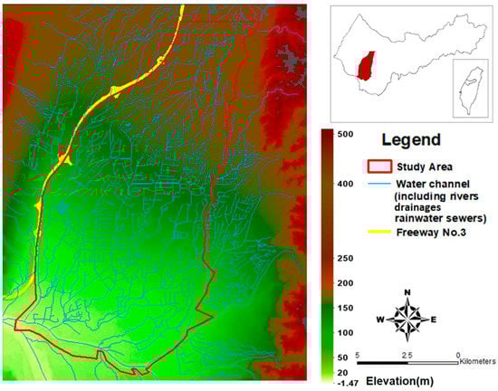 The 126 km2 study area is in the urban area of Taichung City, mostly covering a densely populated area. The terrain elevation tilts from north to south, and the direction of the flow is generally from north to south, as shown in Figure 1. Rivers, drainage, and sewer systems in this area constitute a complex water network system, and it is difficult to divide this area into different parts for parallel computing (Figure 1).