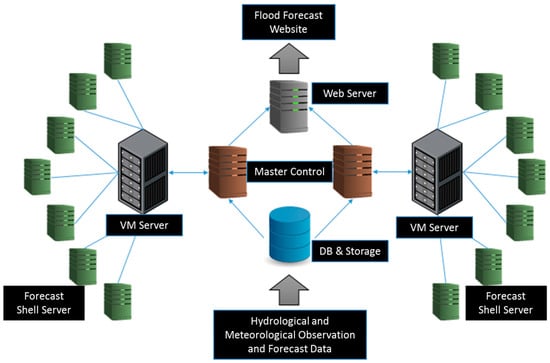 All of the Virtual Machines were setup with a cloud-based system and each physical server was equipped with Intel Xeon Et-2640 v2@ 2.00 GHz × 4, 196 GB memory, 16 cores, and 32 threads. Four threads were used in one Virtual Machine, in which one SOBEK model was executed to simulate each unit. All of the Virtual Machines started simultaneously every hour during storms. Seven Virtual Machines were distributed in one physical server to ensure stable performance of the 2D flooding simulation.
