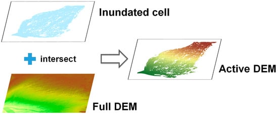 The ability of the SOBEK model to handle grid computation can only be around one million levels, and the computational efficiency will decrease as the number of grids increases. The active-cell technology adopts extreme rainfall scenarios to conduct inundation simulation to determine the greatest inundation. The grids that were not inundated were then removed, leaving only the grids that were inundated, which is “active-cell”, so as to effectively reduce the number of grids in order to enhance the effectiveness of the computing process (Figure 3). Though the inactive cells are excluded from the whole modeling process, the water balance is still satisfied during the modeling. SOBEK adopts the RR-1D-2D coupling modules to simulate different hydrologic processes. The Rainfall-Runoff (R-R) module will meet the water balance of the Rainfall-Runoff conversion process. As for the terrain-related flow path, slope and other parameters within the RR module are estimated using the original DEM. The active-cell DEM is used for the 2D flood flow module and has no relationship with the RR module. After the runoff converges into the channel, the 1D-2D coupling modules are used to calculate the 1D channel flow and 2D overland flow simultaneously. Because the active-cell contains the inundated cells due to extreme rainfall events, it meets the grid needs for normal rainfall events. In theory, the 1D-2D hydrological calculation has a very high conservation of mass. The advantage of those methods is the computation time of the 2D flood model can be shortened, and at the same time the accuracy of the simulation results can be maintained to a certain standard. The disadvantage of the active-cell method is only applicable to the RR-1D-2D coupling model, and is not suitable for the pure 2D overland flood model.