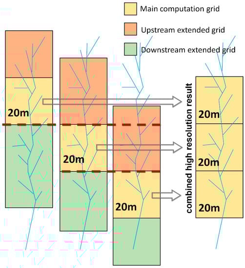 In this study, a near real-time forecasting model for large scale domains is developed via a domain partition concept similar to, but slightly different from the domain decomposition approach. The multi-grid method divides the entire urban area into several calculation units according to the terrain from high to low elevation. Every unit includes the main computation grids and their upstream and downstream layout. The purpose of the upstream layout of the grid is to consider the overland flow in the upstream direction, and the purpose of the downstream layout of the grid is to ensure smooth overland flow out of the main computational grid. The function of the extended grid is to ensure the accuracy of the computational grid’s simulation results and to avoid the impact of the changes in the upstream and downstream flow fields on the computation grid. Each calculation unit is calculated individually and combined together to get the simulation result of entire urban area (Figure 4).