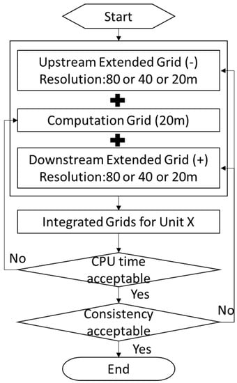 In this study, the multi-grid method divided the entire urban area into eleven calculation units, in which all the main computation grids of each calculation grid were of 20 m resolution. Each main computation grid has its upstream and downstream extended grids. The resolution of the extended grids were 20, 40, or 80 m in this study. The scope of the layout of the extended grids in the upper and lower streams should be as narrow as possible or should adopt grids with low resolution in order to reduce the number of grids and the calculation time. On the other hand, the calculation precision of the grid itself must be kept correct. Therefore, it is necessary to discern how to determine the extension grid range and its spatial resolution. This study adopted a measurement standard by ensuring the accuracy of the main computation grid simulation results, in which the error validation coefficient of the inundation area must be more than 80% and the average error of inundation depth must be below 5 cm. Thus, the extended grid was preferentially tested with an 80 m resolution grid. When the accuracy of the simulation results of main computation grid fails to achieve the desired result, the extended resolution was then changed to 40 m and tested again. If the standard was still not achieved, the extended resolution was then changed to 20 m. The process of this numerical experiment was in fact to balance the computational efficiency and result’s accuracy. The overall process is shown in Figure 5.