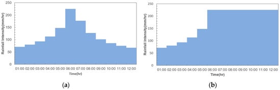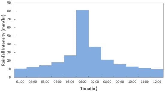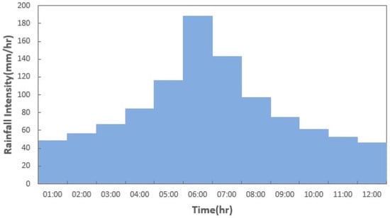 This research first adopted extreme storm scenarios to conduct inundation simulation to simulate the most serious inundation events. Then, the non-inundation grids in the model were removed, leaving the active-cell of inundation grids to reduce the overall number of grids and increase the computational speed. The “extreme storm” situation used in this study was based on the 12-h rainfall with a 500-year return period, and the first 6 to 12 h of rainfall were maintained at the maximum rainfall, as shown in Figure 6. The simulated inundation situation can be considered as the most serious inundation event. A non-inundation computation grid under such extreme storm conditions will present non-inundation conditions under other rainfall situations. As a result, these computation grids would not necessarily be involved in the calculation, while other computation grids would be used for subsequent analog calculus (Figure 3).