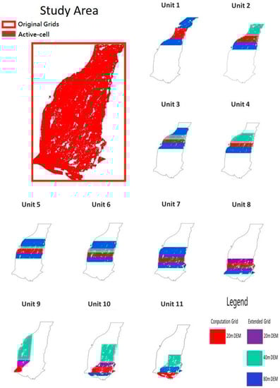 This research divided the downtown Taichung City into 11 calculation units, in which all the main computation grids of each calculation grid were of 20 m resolution. As the terrain elevation of this study area tilts from north to south and the direction of flow is also roughly from north to south, the multi-grid layout was conducted by stitching grids from north to south, as shown in Figure 8. The main computation grid and the number of extended grids of each calculation unit are shown in Table 2.