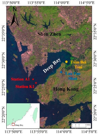 Location of Deep Bay, China, and in situ sites (A1 and K1, red stars), the tidal measuring station at Tsim Bei Tsui (yellow circle) and meteorological measuring station at Lau Fau Shan (blue triangle). The image is from Landsat/TM observation on 2 November 2009 (RGB = band 5, band 4, band 3).