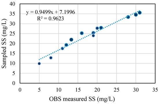A backward light scattering sensor (OBS, the D & A Instrument Company in Logan, UT, USA, https://www.campbellsci.com/obs-3a) was used for SS measurement. The OBS measures the suspended particles by receiving the amount of infrared radiation and establishes the correlation between the water turbidity and the measured SS [48]. At constant diameter and low SSC (<5000 mg/L mud or <50,000 mg/L sand), the area of the illuminated particles is proportional to SS and OBS measurements provide accurate and reliable estimates of SS [49].