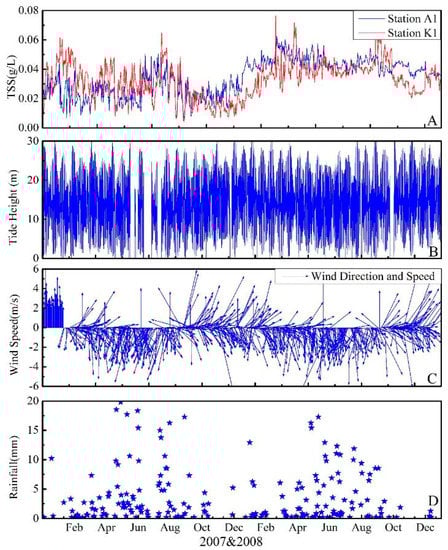 Half-hourly time series of SS (mg/L) at stations A1 and K1 (A) with concurrent time series of tide height (m) at Tsim Bei Tsui (B), wind speed (m/s) and wind direction () at Lau Fau Shan (C), and rainfall (mm) at Lau Fau Shan (D). The time shown here is local time (Beijing Time), starting from midnight on 1 January 2007 and ending on midnight on 1 December 2008.