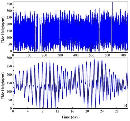 Deep Bay is influenced by a semidiurnal tidal cycle, with two nearly equal high tides and two ebb tides every lunar day (about 24 h 50 min). The tidal data measured at Tsim Bei Tsui (TBT) (Figure 1) were provided by the Marine Department of Hong Kong. Tide samples were collected from 2007 to 2008, with the same frequency as the SS data (Figure 3B). The tidal range of Deep Bay is between −10 cm and 366 cm. Figure 4 presents long-term tide height for 2007 and 2008, and detailed tide heights of January 2008 and indicates that the tides are cyclical.