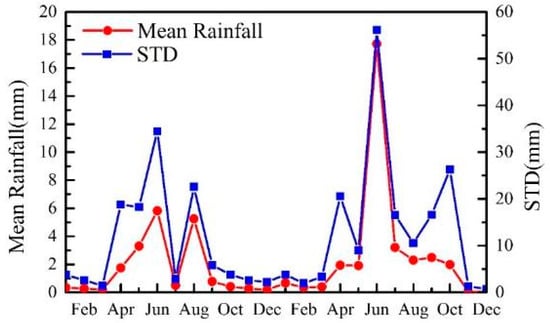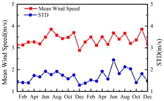Compared with rainfall, the wind speed was relatively stable in each month. The monthly mean wind speed was around 3.4 m/s. The mean and STD of wind speed are shown in Figure 6. The wind STDs ranged between 1 and 2.5 m/s. On the whole, the monthly wind was roughly consistent. However, during the summer, there was higher variation in the wind speed than in other seasons.
