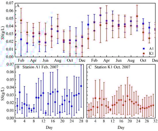 Monthly mean suspended sediment (SS) concentrations (points) and their standard deviations (bars) in 2007 and 2008 at stations A1 and K1 (A) and daily mean SS concentrations (points) and their standard deviations (bars) in February 2007 at station A1 (B) and in October 2007 at station K1 (C).