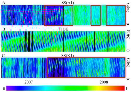 Raster image of suspended sediment (SS) at stations A1 (A) and K1 (C) and tide (B) in 2007 and 2008. The row of each part represents the 24 h in a day and the column of each image covers the 731 days of two years of measurements. The color denotes the normalized value and black sections represent missing data. Data in red frames show measurements of SS at each station that have a highly similar temporal pattern to the tides.