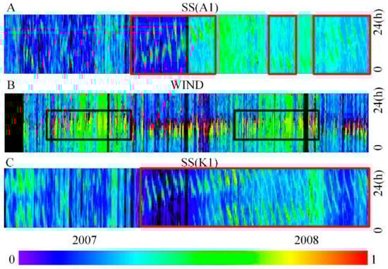 Raster image of suspended sediment (SS) at station A1 (A) and K1 (C) and wind speed (B) in 2007 and 2008. The color denotes the normalized values and black sections represent missing data. Red frames in the SS image indicate variations with regular patterns. Wind speed with black frames indicates high wind speed data, which corresponded to SS data with both a regular and irregular temporal pattern.