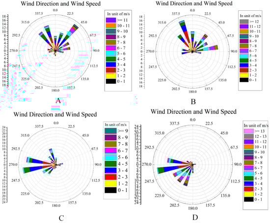 The wind direction and wind speed at June 2007 (A), July 2008 (B), March 2007 (C) and November 2008 (D) at Lau Fau Shan meteorological station.