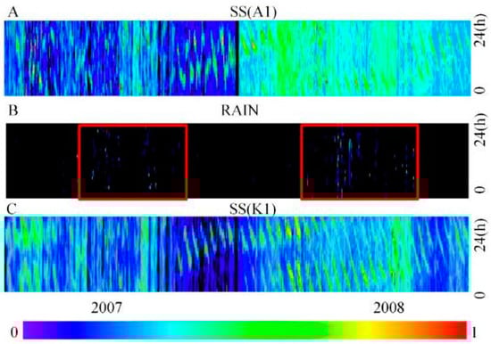 Raster image of suspended sediment (SS) at station A1 (A) and K1 (C) and rainfall (B) in 2007 and 2008. The color denotes the normalized values and black sections represent missing data. Red frames in rainfall image indicate the rainy season.