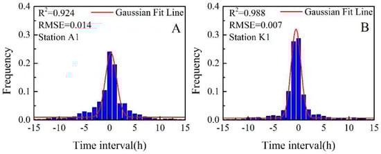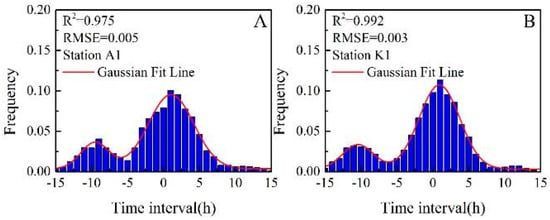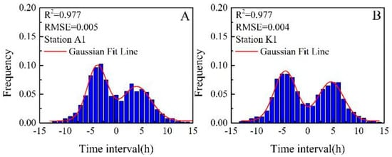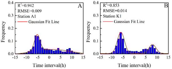 The same approach was employed to analyze the relationship between the maximum SSC and the TLW. Figure 13 demonstrates a high consistency of the maximum SSC and the TLW. The time interval peaked around 0 h for both A1 and K1 stations. The Gaussian fit model passed the significance testing, and the fitted line was a skinny bell curve and thin tails, which represents a highly concentrated data distribution. This indicates that sampling for the maximum SSC should take place at the TLW.