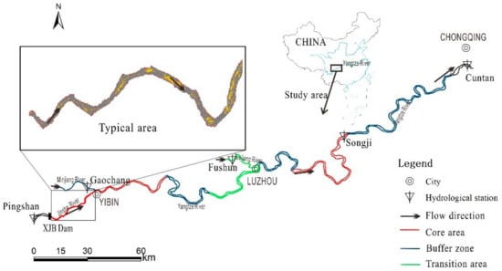 A field survey using an echo sounder and ADCP was conducted in the Upper Yangtze River from Shuifu city, Yunnan Province (about 2 km downstream from the Xiangjiaba Dam) to Chongqing city (upper end of the Three Gorges Reservoir) (Figure 1 and Figure 2), covering a stretch of about 392 km []. This stretch of river passes through a mountainous area with elevations mostly less than 500 m above the river level. The river morphology within the study area is uneven and has many elevated points, central bars, and reef structures shaping the river bed, with riverbed gradients of 0.27−0.40%. At the Jinsha section (Shuifu-Yibin), the river is typically 150−200 m wide. The river widens downstream of Yibin, typically varying between 200−300 m and 600−800 m within and outside the gorges, respectively. The maximum river width broadens at certain points to 1000−2000 m. The average annual water level at Zhutuo during the period 1956−2014 was 200.13 m (daily mean range 196.21−216.31 m) with a flow rate of 8520 m3/s (daily mean range 1920−53,400 m3/s). Four major cities (Yibin, Luzhou, Jiangjin, and Chongqing) are located along the river and buildings have been constructed along the river banks (Figure 1). Since 2005, the reach of river from Shuifu to Chongqing (385.26 km, 98.3% of the length of the study area) has been a part of the Upper Yangtze National Reserve. Following an international designation from the United Nations Educational, Scientific, and Cultural Organization (UNESCO), biosphere reserves were demarcated into three inter-related zones: the core area, the buffer zone, and the transition area outside the buffer zone. The present study’s reach was designed to include the three zones (Figure 1). The main stream includes two sections of the core area, four buffer zones, and three transition areas. However, three additional dams, Shipeng, Zhuyangxi, and Xiaonanhai (Figure 2) are being planned for this river stretch.