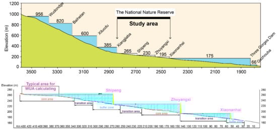 The Physical Habitat Simulation (PHABSIM) component of the IFIM is a popular technique used to predict habitat for aquatic species with change in water flow []. Multiple habitat suitability criteria for depth, velocity, substrate and cover, which are species specific and life-cycle related are used to predict depth and velocity of the water body. The weighted usable area (WUA) habitat index is computed using the predicted information along with substrate or cover-related information []. The WUA output is normally used to simulate the usable area for rivers, which includes a range of stream flows. This paper established a two-dimensional physical habitat model of the river segment based on the coupling of the hydrodynamic model and fish information model and calculated the ecological water demand of the river. The River2D model is suitable for microenvironment assessment and meso-scale habitat simulation, but unsuitable for large scale habitat simulation []. Therefore, we selected an important core area (Xiangjiaba-Yibin) as the study area for three reasons: (1) it is one of the two core areas in the National Nature Reserve; (2) it responds directly to the influence of upstream reservoir (Xiangjiaba) regulation; and (3) it serves as the spawning grounds as well as a fertile field for several rare and endemic fishes.