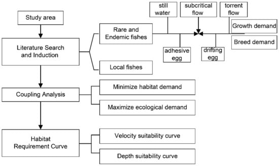 A good understanding of the physical habitat of the river’s environment is vital for ecological flow assessment as factors such as water flow, discharge, depth, and channel index affect aquatic organisms []. The general workflow for assessing river habitat properties using an inductive literature search is shown in Figure 3. Several factors such as the degree of endangerment, ecological value, data acquisition difficulty, and species representativeness were taken into consideration during the selection of indicator fishes. Additionally, we analyzed growth and breeding requirements during the same period. Expert consultation and an extensive literature review was conducted to identify the principle for coupling analysis, namely, “minimization of habitat demand and maximization of ecological demand” to meet the needs of all indicator fishes. Finally, velocity suitability curves and depth suitability curves were utilized as the basic data for model operation.