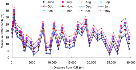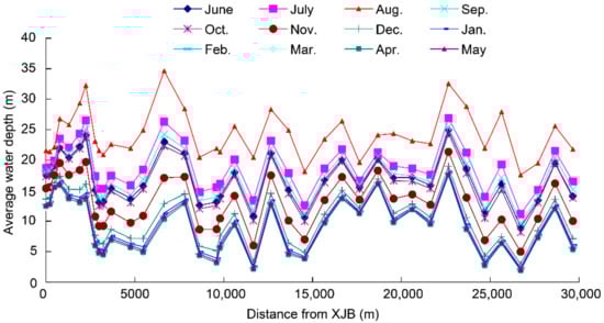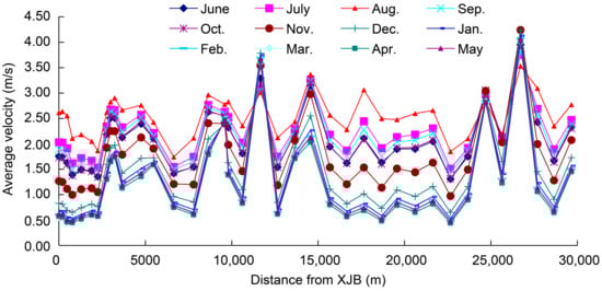 This study analyzed the basic hydrological parameters of the natural river course during the dry season, before the Xiangjiaba dam was constructed. The results in Figure 4, Figure 5, Figure 6, Figure 7, Figure 8, Figure 9 and Figure 10 illustrate various parameters of the natural hydrologic process. It provides the basis for ecological demand analysis of the downstream. We found that the hydraulic parameters differed for different periods/months.