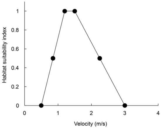 WUA is used as the habitat index for target aquatic species and life stages in the River-2D model []. Considering habitat suitability criteria of water depth, velocity and channel index for the chosen target species and life stages, WUA-discharge (Q) relationship can be obtained using the habitat modeling function in River-2D. The peak of the WUA-Q curve generally indicates the river flow that provides the most suitable habitat for the target species [].