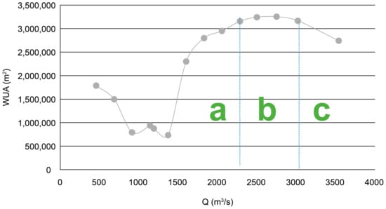 Considering the change in WUA as a function of discharge, three different areas can be recognized (Figure 13): an area (a), where the rate of WUA increase is higher, an area (b), where the curve appears linear with a small change in slope, almost constant with t; and an area (c) where WUA decreases significantly with an increase in discharge.