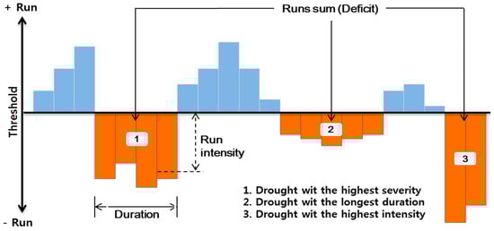 Drought characteristics includes various drought conditions, such as duration, severity, and intensity. A probabilistic methodology widely used in drought characterization is the application of runs theory [34], which allows the estimation of the return periods of extreme events [35]. We applied runs theory to analyze drought characteristics based on SPEI_th and SPEI_pm. Figure 1 shows the drought characteristics using the run theory for a given threshold level. A run is defined as a portion of the time series of a drought variable, in which all values are either below or above the selected truncation level; accordingly, it is called either a negative run or a positive run [5]. In runs theory, drought intensity is the average value of a drought parameter below the threshold level, which is measured as the drought severity divided by the duration [36]. In this study, we set SPEI of −1 as the threshold value for identifying drought conditions, with SPEIs below −1 being used to estimate drought intensity.