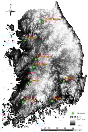 In this study, eight locations in South Korea, nationwide, were selected, as shown in Figure 2. The northeast region is representative of mountainous terrain, and the largest farmland is located in the western region, where there are wild plains. We selected 8 meteorological stations covering the main agricultural fields. Four stations—the Chuncheon (code: 101), Suwon (119), Cheongju (131) and Daejeon (133)—are located in the northern and central regions, which are located between 36 and 38° N; while the others—the Daegu (141), Jeonju (146), Gwangju (156), and Jinju (192) stations—are located in the southern region, between 34 and 36° N. The annual mean temperature and rainfall for the stations between 1981 and 2010 were examined, and the results are shown in Table 2. The highest annual mean temperature among the target locations was observed in Daegue, while the lowest temperature was in Chuncheon. The largest volume of annual rainfall was observed in Jinju, near the south coast of the Korean Peninsula.