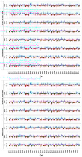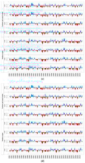 Based on log-logistic distribution, 1- and 3-month SPEIs were calculated as the drought index from 1981 to 2010, and the results are shown in Figure 3. According to the Drought Impact Survey Report in Korea, major drought events occurred in Korea during the periods 1981–1982, 1994–1995, and 2001–2007 [43,44]. The results of the SPEIs in this study are able to reflect these major drought events. In the northern and central regions, the lowest 1-month SPEIs in August were found for Cheongju and both the 1-month SPEI_th and SPEI_pm were calculated at −1.6 (severely dry) in 1988, followed by Chuncheon (−1.6), and Suwon (−1.4). The frequency of drought was higher in the southern region than the northern and central regions. In 1994, the 1-month SPEI_th and SPEI_pm in July were −2.6 and −2.3 (extremely dry), respectively in Daegu. In addition, SPEIs below −2.0 were estimated for Jeonju, Gwangju, and Jinju in July, 1994. With regard to 3-month SPEIs, drought conditions were shown clearly in 1994. In particular, short-term drought conditions continued during 1994–1997 and 2006–2009. These results indicated that more severe short-term drought had occurred in recent years, especially in the southern region, rather than the northern and central regions, as shown in Figure 3c,d.