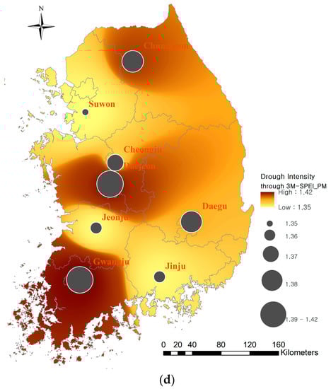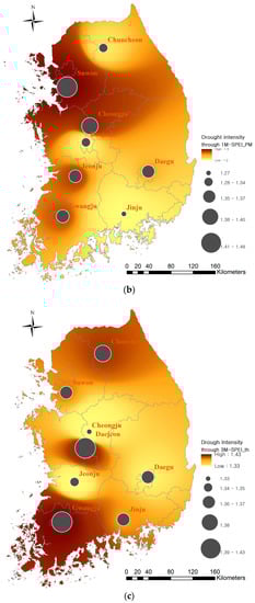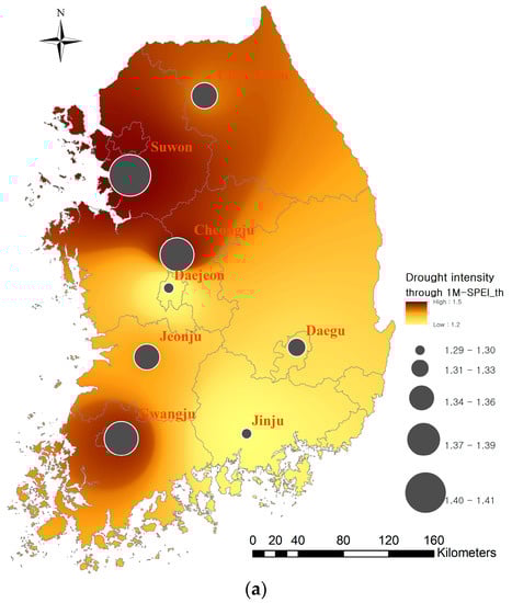 The drought intensity based on SPEI_th and SPEI_pm was analyzed at each station using runs theory, as shown in Figure 4, which also displays the distributed drought intensity using inverse distance weight interpolation as the background. 1-month SPEI_pm showed slightly more intensive drought than 1-month SPEI_th at most of the stations, except for Chuncheon and Gwangju. In particular, in Suwon, drought intensity obtained from 1-month SPEI_pm was 1.47, but 1-month SPEI_th showed 1.41. In the case of 3-month SPEIs, the southern and central regions had more intensive drought than the northern region. In particular, Gwangju and Daejeon showed the highest-intensity drought from both 3-month SPEI_th and SPEI_pm. To sum up, the northwest and southwest regions had a higher intensity of 1-month drought, and the central and southwest regions had a higher intensity of 3-month drought. In particular, the largest farmlands are located in the southern and western regions; thus, the impacts of drought on agriculture could be serious in Korea.