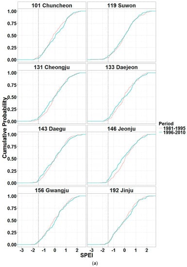 We also analyzed the trends of time-series SPEIs using the MK test. The increasing trend of SPEIs was shown for the fall season, and the cumulative probability that the SPEI_pm was below −1.5 also increased significantly. These results indicated that the frequency of severe drought had increased between 1981 and 1990.