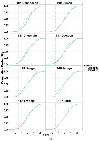 We also analyzed the probability of drought occurrence when estimated using the cumulative curves of SPEI. First, the SPEI was calculated for the total period (1981–2010); after that, we collected SPEI results during each period (1981–1995 and 1996–2010). Finally, we analyzed the cumulative curves of SPEI for the two periods, respectively, as shown in Figure 5. At 5 stations—excluding Chuncheon, Gwangju and Jinju—the cumulative probability that 1-month SPEI_pm was below −1.5 increased significantly from 1981–1995 to 1996–2010. The greatest increase of cumulative probability was shown in Jeonju (4.8% increase), followed by Cheonju (4.5% increase), Suwon (4.4% increase), Daejeon (3.3% increase), and Daegu (1.7% increase). In the case of 3-month SPEI_pm, in Daejeon, Daegu, Jeonju and Suwon, the cumulative probability that 3-month SPEI_pm was below −1.5 decreased from 1981–1995 to 1996–2010. The greatest increase of cumulative probability was shown in Jeonju, from 4.4% (1981–1995) to 7.8% (1996–2010), followed by Daejeon from 5.6% to 6.7%. However, Chuncheon and Gangju showed an increase in the cumulative probability that 3-month SPEI_pm was below −1.5; in particular, the cumulative probability that 3-month SPEI_pm was below –1.5 in Chuncheon during the period 1981–1995 was 8.9%, and it decreased to 2.8%.