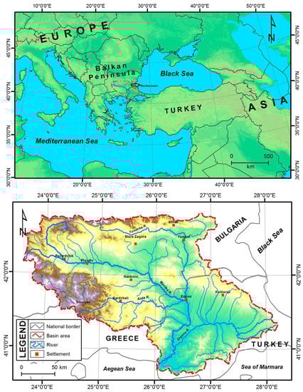The Maritsa Basin, with an area of 53,000 km2 [], is located within the borders of three countries (Bulgaria, Turkey, Greece) in the Mediterranean Basin. The study area (42°52′40″–40°37′20″ N; 23°35′31″–28°14′36″ E) is one of the largest transboundary river basins of the Eastern Europe and Balkan Peninsula (Figure 1).