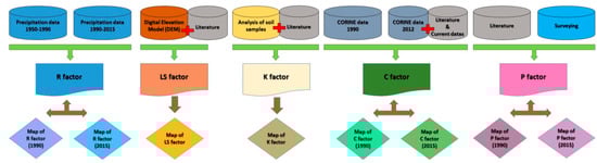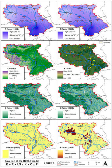 During the simulation, the RUSLE method was used in two time steps in the years 1990 and 2015, which were relatively assigned in the dynamic parameters (Figure 2). In fact, the LS-factor and K-factor controlling erosion in the RUSLE method are more constant factors through years, while the R-factor, C-factor, and P-factor are more dynamic parameters [].