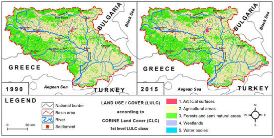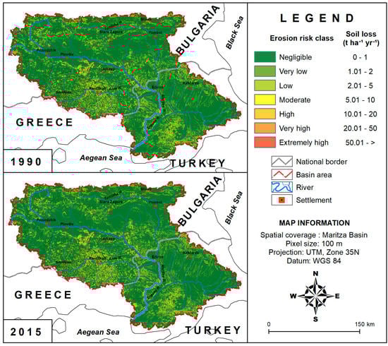 The aim of this research is to enhance understanding of the relative importance of dynamic parameters, especially LULCC, on soil erosion and to monitor erosion risk zones using the RUSLE equation in the Maritsa Basin. Dynamic parameters in the simulation (e.g., rainfall erosivity, R-factor; cover management, C-factor; and conservation practices, P-factor) were divided into two time frames as in 1990 and in 2015 [,,,,,,,,,,,,,,,,,,,,,,,]. The research also aimed to determine the impacts of dynamic parameter changes on the risk of erosion at catchment scale. This study also allows for determining the intensity of gross soil loss not only in Europe, but also in its surroundings in Turkey.