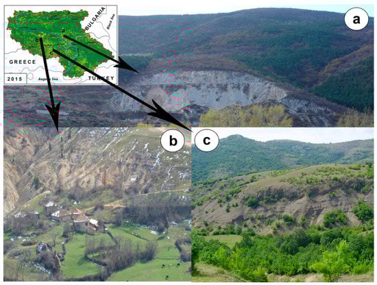 Severe soil erosion-prone areas in the Maritsa Basin, illustrating the region with (a) higher vegetation density is supposedly less prone; (b) sparse vegetation density is supposed more prone; (c) moderate vegetation density is proposed as moderately susceptible to soil erosion.