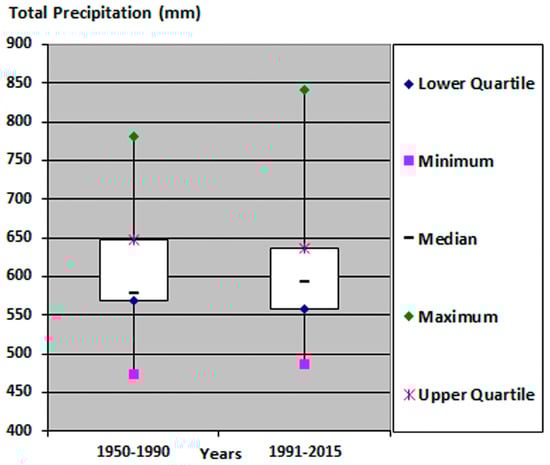 In recent years, climate, especially precipitation, has shown a slight upward trend similar to the world’s river basins []. Numerous studies have already addressed the probable impacts of climate change to soil erosion [,,]. The statistics demonstrate that the changes in precipitation are limited, but a notable rise in the annual minimum/maximum, and total annual precipitation was found during the period of 1991–2015 compared to 1950–1990 period. Furthermore, the statistics for the period of 1991–2015 represents alike symmetrical distribution, while the annual precipitation values in the period of 1950–1990 is more negatively skewed (Figure 6). As seen in the figure, the tail of 1950-1990 is longer on the left, which is related to deviations in the precipitation regime since rainfall has more recently become characteristic of the form of heavy storm events [,,]. The deviation in the precipitation regime also reflects that the intensity of the erosion through recent catastrophic rainfall has been increasing even more.