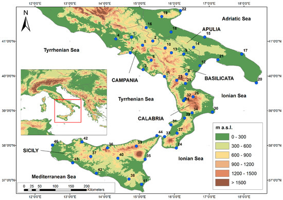 - Pellicone, G.; Caloiero, T.; Coletta, V.; Veltri, A. Phytoclimatic map of Calabria (Southern Italy). J. Maps 2014, 10, 109–113. [Google Scholar] [CrossRef]