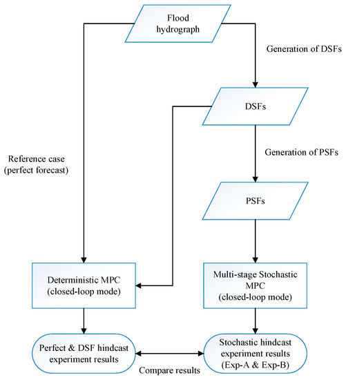 The general framework of the experiments. DSFs stands for Deterministic Streamflow Forecasts. PSFs stands for Probabilistic Streamflow Forecasts. MPC stands for Model Predictive Control.