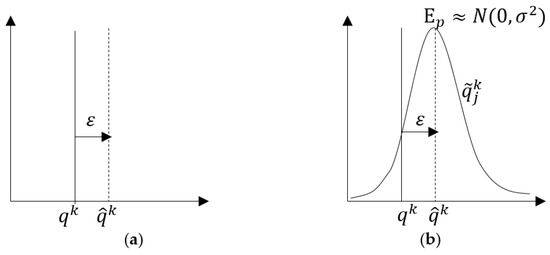 Schematic of single time-step streamflow forecast uncertainty: (a) DSF schematization; (b) PSF schematization. stands for observed inflow. stands for relative inflow forecasting error. stands for DSF member. stands for PSF member. stands for time index.