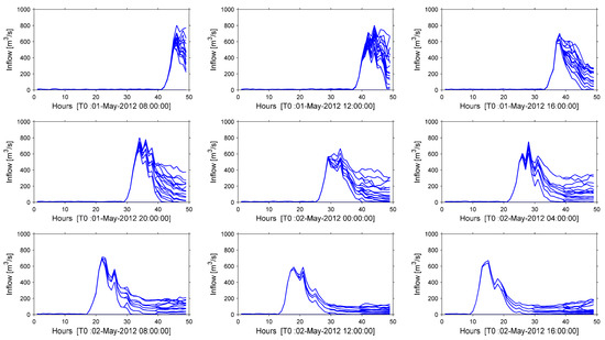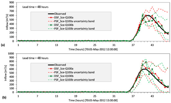 As explanatory example from two scenarios (Sce-Q100a and Sce-Q100b) is shown in Figure 4 for a lead-time of 48 h. Fifty members are generated for PSFs, but only two members (min and max values) are given in the figure to show the uncertainty ranges (referred to uncertainty band). In the figure, [T0] corresponds to “time zero” namely the starting time of the optimization. Two time instants [T0: 01-May-2012 12:00:00] (Figure 4a) and [T0: 01-May-2012 13:00:00] (Figure 4b) are exampled here, but the process is dynamically repeated in each one hour throughout the hindcasting period in closed-loop experiments for each scenario. Finally, each scenario is composed of all generated 96 forecast sequences (both in DSFs and their PSFs) having a 48 h lead-time in the hindcasting period.
