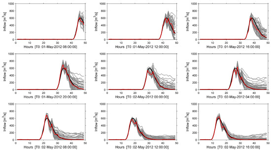 An example of generated forecast data sets (Sce-Q100a) is given for different time steps shown by T0 in Figure 5. Similarly, [T0] corresponds to “time zero” namely the starting time of the optimization in the figure. The red dashed line shows DSFs which are derived from a perfect forecast by 30% random noise. Synthesized PSF data are shown in gray ink. While generating PSF, updated forecast data have “different starting time” and “different duration to the peak flow” which affect the uncertainty band in the end. For example, the starting time of the 01-May-2012 20:00:00 (fourth panel) and 02-May-2012 00:00:00 (fifth panel) have less duration to peak flow, thus they have higher dispersion at peak flow compared to the last panel and subsequently uncertainty is kept high in the falling limb in the fourth and fifth panels. However moving forward in time, the duration to peak flow at T0 decreases, so that the relative standard error cannot increase too much due to the flow condition. That is the reason why the last panel has less spread in the end. It is directly related to the approach used to generate the ensembles.