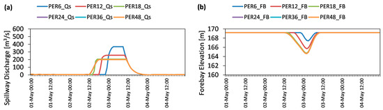 It is assumed that selecting a sufficiently long forecast horizon in the closed-loop mode provides an approximately actual infinite horizon solution [54]. In the first trial, hindcasting experiments were employed using perfect forecasts with respect to different forecast horizons. The tests were conducted for 6, 12, 18, 24, 36, and 48 h to estimate a sufficiently long forecast horizon, and named as PER6, PER12, PER18, PER24, PER36, and PER48, respectively. The results of the experiments are presented in terms of spillway discharges and forebay elevation in Figure 7. Short forecast horizons (such as 6 h and 12 h) produce delayed releases which in return increase peakflow at the dam outlet. This is an important indicator of flood risk assessment since higher discharges create a larger extension of damage in the downstream area. Therefore, MPC needs a longer forecast horizon to handle the problem even with perfect inflow forecasts. Forecast horizons of 18 h or longer provide downstream safety by reaching reasonable maximum discharges under 200 m3/s limit at the outlet. Longer forecast horizons than 18 h e.g., 24, 36, and 48 h, result in a similar response. Therefore, the experiment results of PER24, PER36, and PER48 overlap in the figure. According to the results, one can note that the mitigation of a major flood even with maximum operating levels and 200 m3/s downstream channel constraint can be achieved under perfect future knowledge of flood inflows at least 18 h beforehand.