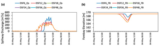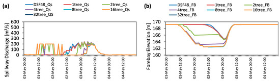 The number of tree branches used in TB-MPC is user-defined and there is no direct method to select the most appropriate one. In this part, performances of TB-MPC hindcasting experiments using Sce-Q100a data are conducted by selecting a different number of tree branches in each trial and the results are compared with each other. According to TB-MPC methodology, total PSF members can be reduced to 2x branches, e.g., 1, 2, 4, 8,… etc. [24]. Therefore, in this study 50 PSF ensembles were reduced to six different branches (1, 2, 4, 8, 16 and 32) and tested in a hindcast test. The experiments were done using Sce-Q100a PSF as input forecast data and comparison of the optimization results from different tree branches numbers is given in Figure 10 in terms of spillway flows and forebay elevation. This experiment shows the effects of the resolution of tree and correspondingly capturing forecast uncertainty in stochastic optimization. If the forecast horizon is set to 48 h, we can get optimum results after 16 branches as shown (Figure 10a) in terms of the spillway discharge. Since the results for 16–32 trees are exactly the same, they overlap with each other in the same figure. Although higher resolution overestimates the inflows which increases the pre-releases, it is still able to restore the forebay elevation target at the end of the flood event (Figure 10b).