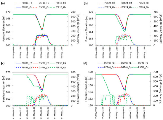 Figure 11 presents a comparative visualization of different hindcasting experiments with perfect data and DSF under deterministic configuration and PSF under multi-stage stochastic TB-MPC for 18, 24, 36, and 48 h forecast horizons. Notice that deterministic methods have similar results for a longer forecast horizon whereas TB-MPC start earlier pre-releases. This is mainly attributed to consideration of uncertainty resolution through the forecast horizon in the decision mechanism. When the selected forecast horizon increases in TB-MPC experiments, the uncertainty band in the PSF spread increases and thereby much more water is evacuated from the spillway with the more conservative policy for flood control. It is remarkable to note that even when a longer forecast horizon is selected, forebay elevations at the end of the flood event are always equal to the initial reservoir elevation. These results are also valid for the remaining scenarios.