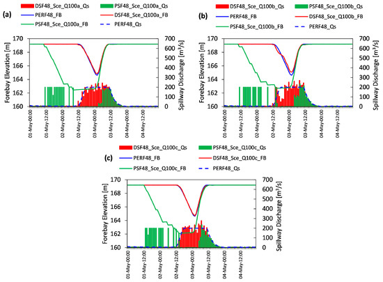 The hindcasting experiments having forecast horizons of 48 h were enriched with different inflow conditions to check the robustness of the developed methodology. To that end, hydrographs characterized by return periods lower than 100 years such as 25 and 50 years, which have peak flows greater than the downstream channel capacity, were also used in the closed-loop hindcasting experiments. All experiments were evaluated by forebay elevation at the end of the flood event, the penalization of the flooding threshold value by the peak flow observed at the Yuvacık outlet, the total flood volume at the downstream area, and FSI. Similar to the previous set-up, flood hydrographs were independently utilized in each hindcasting test as perfect data, DSF and PSF data sets were generated. The tests were also elaborately investigated with three different independent scenarios (a,b,c) for each flow condition. The complete results belonging to the hindcasting experiments are given in Supplementary Figures S2 and S3 for Q25 and Q50 scenarios, respectively. On the other hand, deterministic (perfect and DSF) and stochastic (PSF) closed-loop MPC results from Sce-Q100a, Sce-Q100b and Sce-Q100c are shown in Figure 12. It is notable that the stochastic set-up always provides pre-releases and takes precautions against flood event. The deterministic model only takes actions over several hours which is similar to the perfect data based reference model, but generates much more spillage above the flood threshold compared to stochastic TM-MPC.