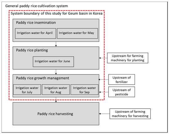 Paddy rice production consumes more than 95% of all water during irrigation [26,27]. The electricity consumption, fuel consumption, and pesticide and fertilizer consumption were therefore excluded from the system boundary of the rice production as shown in Figure 1.