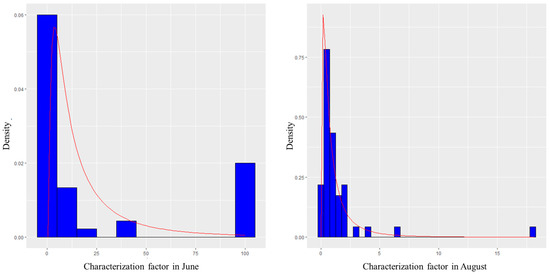 Figure 2 shows the histogram in blue and estimated parametric probability distribution in red for the CF for June and August in the Geum River Basin. The probability distribution in August was estimated to be the lognormal distribution based on the Anderson–Darling test, where the null hypothesis was assumed as a lognormal distribution. The probability distribution in June, however, could not be estimated using the Anderson–Darling test because all null hypotheses were rejected. In this case, the lognormal distribution was assumed, as suggested by the IPCC guideline [40] and Jolliet et al. [41].