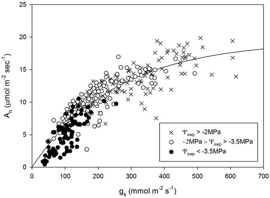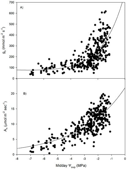 Multiple studies have reported on the threshold for this relationship [,,]. Generally, the best fit, in accordance to our study, is positive and exponential [,,] but also linear [] and logistic regressions were observed []. The main reason for this discrepancy can be the limited variability of ΨSWP values. ΨSWP data set of this experiment widely ranged, from −1 to −7 MPa, and gs increased from 20 to more than 600 mmol m−2 s−1. If only the data points characterized by a ΨSWP above −3.5 MPa are used, a linear and weaker regression is observed also in this work (data not shown); if only data above −2 MPa are analyzed no relationship between ΨSWP and gs is observed.
