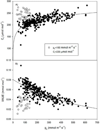 Relationship between (A) the sub stomatal CO2 concentration (Ci, μmol mol−1) and (B) intrinsic water use efficiency (iWUE, mmol mol−1) relative to stomatal conductance (gs, mmol m−2 s−1). Data characterized by gs < 150 mmol m−2 s−1 and Ci > 220 μmol mol−1 (average of the population) were plotted separately. The best fit relationship for Ci was performed using a logarithmic function: y = 71.8 + 26.7 × ln(abs(x)); r2 = 0.52. The best fit relationship for iWUE was performed using an exponential function: y = 0.80 × e(−0.019x); r2 = 0.58.