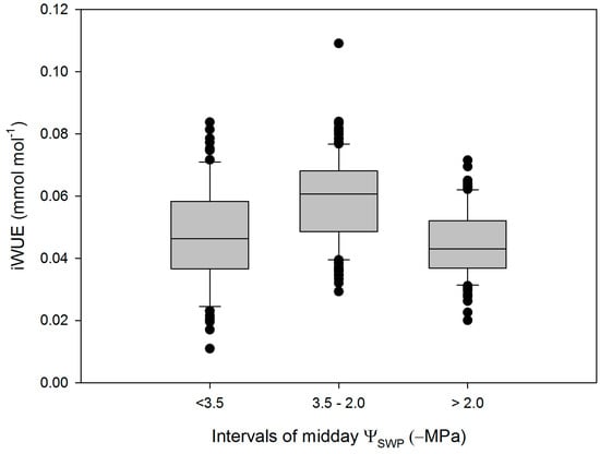 Intrinsic water use efficiency (iWUE) had the highest values (median of 0.06 mmol mol−1) in plants characterized by ΨSWP between −3.5 and −2 MPa. Lower iWUE values (about 0.04 mmol mol−1) were observed when ΨSWP decreased below −3.5 MPa or increased above −2 MPa (Figure 4).